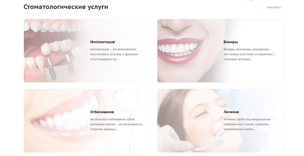 Яркая демонстрация категорий и подкатегорий стоматологических услуг.