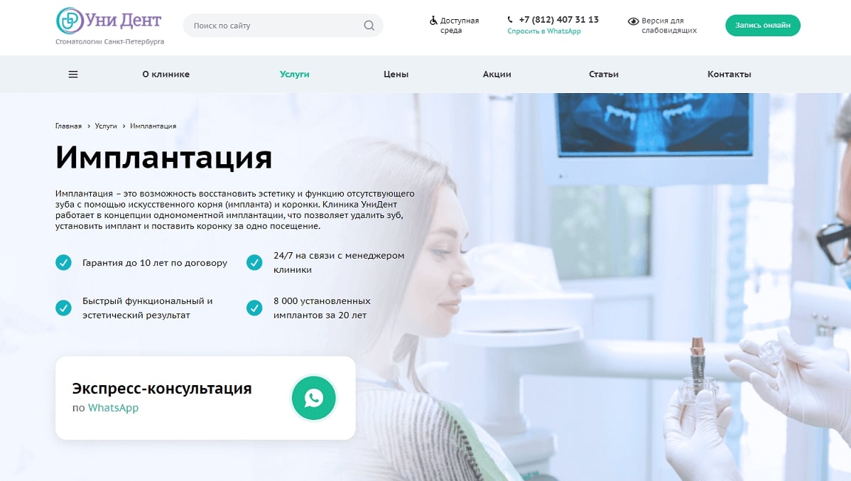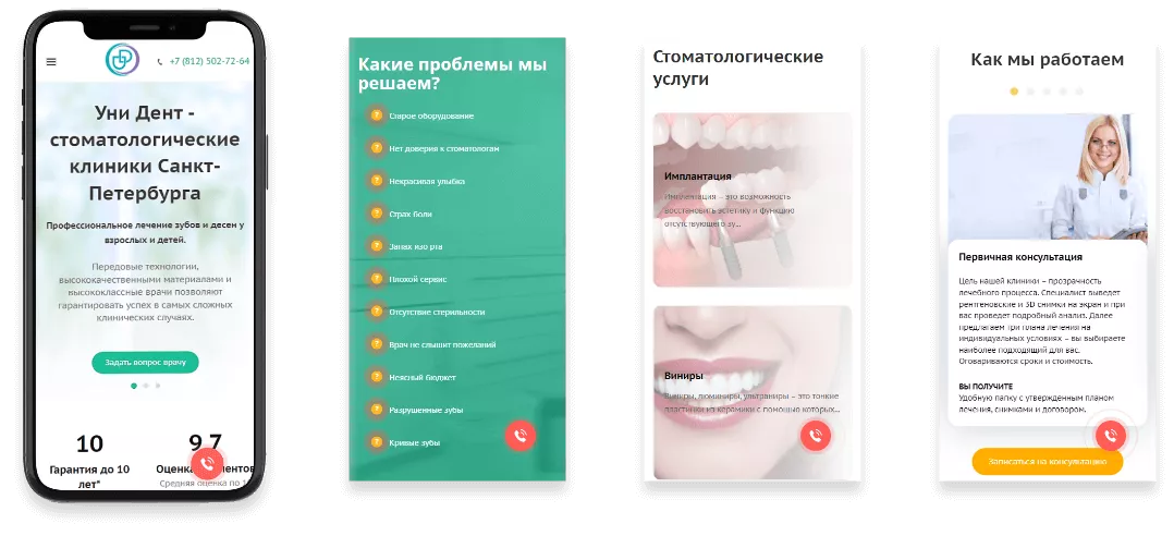 Каждая услуга разработана в формате отдельной яркой посадочной страницы. Первый экран с кратким описанием услуги и возможностью быстрой связи для консультации.